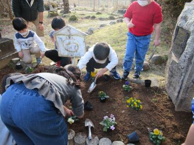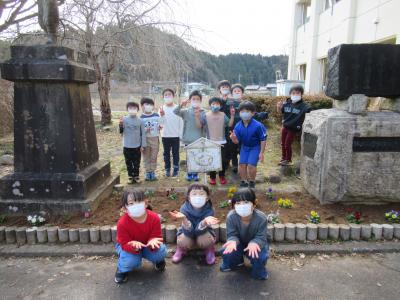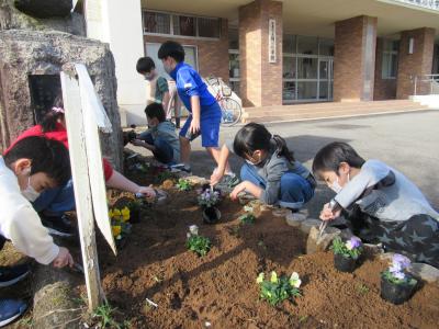 一年生が、児童玄関前の花壇にパンジーの花の苗を植えてくれました。ありがとう。上手に植えることができました。