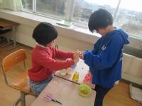 1月27日(月)4限目の4年生の理科は、冬の植物の観察として、桜の木の芽を観察しました。その際に寄付金で購入した百葉箱の中の温度計で気温を確認していました。観察ではかまきりの卵も見つけたそうです。5限目は1・2年生が食べたいものでリクエストしたおでんを作って食べました。具は卵、ウインナー、こんにゃくの3種類。温かいおだしがおいしかったようです。