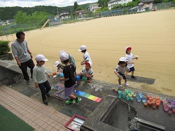 6月5日(水)の2限目は、1・2年生は図工の授業でした。1年生は「カラフルいろみず」の勉強で、水を入れたペットボトルに絵の具を入れて、ペットボトルを振るときれいな色水ができました。2年生は「ひかりのプレゼント」で、透明なカップに色をつけて光を通すとカラフルな影が地面にうつりました。その2つの活動を今日は8人全員で外に出て仲良く楽しみました。