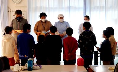 いつもおいしい給食を作って下さる給食調理員の豆田さん、下畠さん。朝,いつも朝玄関で迎えてくれ,壊れた物を直して下さる校務員の酒井さん。校舎の消毒や学習で使う物を準備して下さるスクールサポートスタッフの數馬さん。いつもありがとうございます。これからも宜しくお願いします。みんなが書いた感謝のメッセージを送りました。