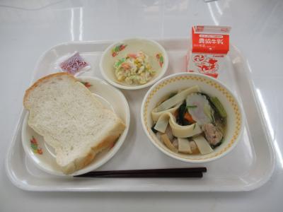 今日は、愛知県の給食です。キャベツとツナのサラダ、きしめんが愛知県の料理となります。