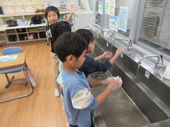 手洗いの授業1・2年、整理整頓の授業5・6年
