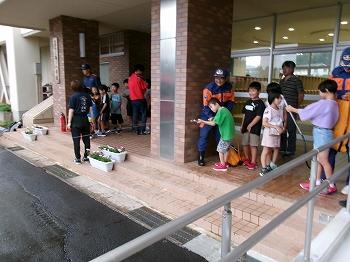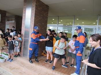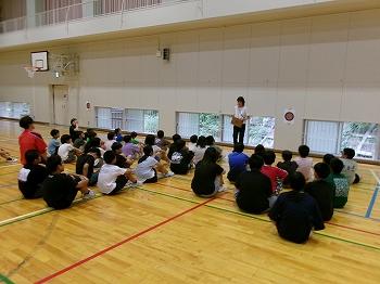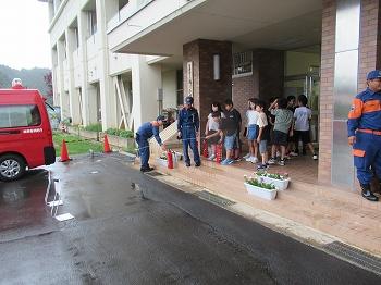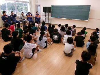 9月12日(金)午後は、予告なしの避難訓練をしました。理科室で火災が発生して、体育館に避難するという想定でしたが、放送をよく聞いて、持っているハンカチで鼻と口をふさぎながら、静かに体育館に避難することができました。その後、消防団による防災教育の授業でした。地震が起きたときの鵜川消防団の話の後、煙体験や放水体験をしました。煙の中を逃げるときには姿勢を低くすることもそうですが、地域には消防団があることがわかりました。消防団の皆様、ありがとうございました。