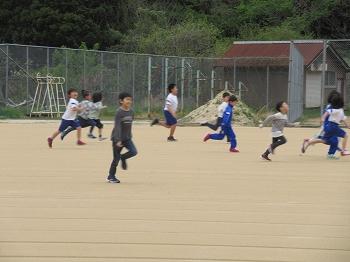 4月28日(月)の午後、うかわっ子委員会が考えた全校遊び「けいどろ」で楽しみました。初めにうかわっ子委員によるルールの説明がありました。警察役に捕まると牢屋に入りますが、すぐに仲間が助けに来てくれます。広い運動場をみんなで仲良く思い切り走りました。