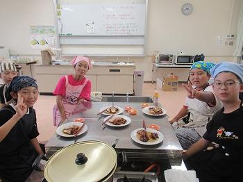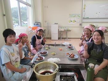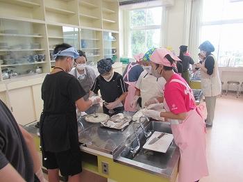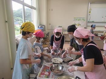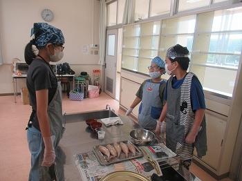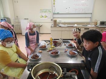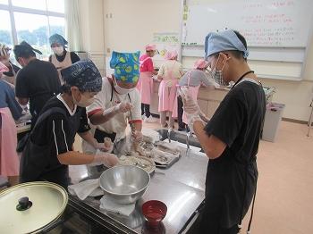 9月29日(月)の午後は、海洋教育の一環として、能登町食生活改善推進委員の方々にいかめし作りを教えていただきました。作った事がない子がほとんどでしたが、委員の方に教わりながら、いかの中にもち米を詰め、甘辛く味付けをし、煮ていました。どのグループも上手に仕上がったようです。りんごのデザートも加わり、みんなでおいしくいただきました。食生活改善推進委員の皆様、ありがとうございました。