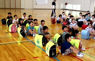 不審者が学校に侵入したことを想定し、警察が来るまで職員が子ども達の教室に行かないよう説得しながら食い止めました。子ども達は、不審者だと分かる秘密の放送を聞いて、速やかに体育館に避難しました。その後、体育館で防犯教室としてして不審者に出会ったときの対応について学びました。元気よく挨拶ができること、不審者との一定距離を空けること、「いかのおすし」の確認をし、防犯ブザーの使い方や、電池が切れていないか点検しました。