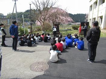 児童は「おさない・かけない・しゃべらない・もどらない・ちかよらない」を守り、素早く玄関先に避難することができました。津波警報が出ているときには、火災がなければ、本校3階へ避難することもありますが、旧鵜川小学校グランドや浄覚寺周辺に2次避難することもあることを伝えました。(旧鵜川小学校までの道が工事中で危険なため、今日は玄関前の避難としました。)