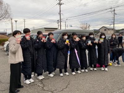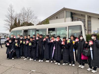 出発式では、生徒会会長より「日頃から皆様には、お世話になっています。今年は、色紙と鉢植えを準備しました。どうぞ、よろしくお願いします。」と挨拶がありました。民生委員長の吉田さんからは「毎年この時期に中学生が訪問してくれることをおじいちゃん、おばあちゃんは大変楽しみにしており、これまでに贈られた色紙をすべて飾っている方もいます。」とお話しをされました。