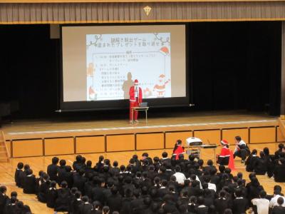 本日、生徒会執行部が企画した「謎解き脱出ゲーム~落としてしまったプレゼント~」が全校生徒参加で実施されました。生徒会長が扮したサンタが落としたプレゼントを3人の泥棒が持って行ってしまい、謎解きをしてプレゼントを取り返すという設定です。生徒はグループになり、泥棒からプレゼントを取り返すために必死に7問の謎解きをしていました。