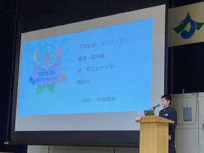 本日、サイエンスヒルズこまつにおいて標記大会が開催されました。本校からバトラーとして参加した2年生の中谷櫂志さんが紹介した「桃太郎、エステへ行く」が見事チャンプ本に選ばれました。