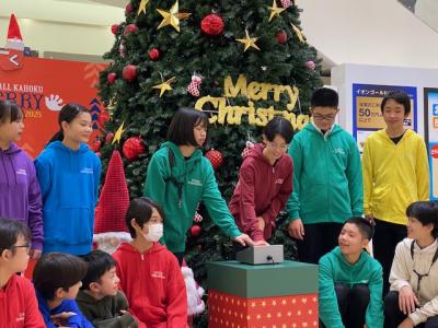 まず、クリスマスツリーの点灯式のお手伝いの後、30分の演奏をさせていただきました。4日(火)の文化祭で演奏をする予定の吹奏楽部にとって、大勢のお客さんの前で演奏することができ、大変良い経験になったと思います。