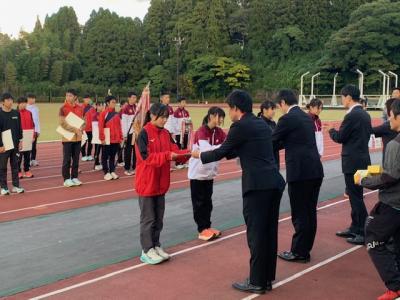 秋晴れの下、標記大会がうのけ陸上競技場周回コースで開催され、女子が第3位、男子が第6位と大健闘しました。(男子は3.0㎞を6人で、女子は3.0㎞を2人、2.1㎞を3人で襷を繋ぎます)チームには、初めて駅伝に出場する選手が多く、招集場所で緊張している様子が見られましたが、走り出すとどの選手も練習以上の力を発揮してくれました。
