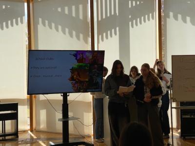 1年生は、9月に実施した「かほく市内の企業見学」を体験して、各グループでまとめたものを発表しました。砂丘農業センターを見学したグループの発表では「加賀しずく」は16年もの研究の結果作り出された梨であること、かほく市役所を見学したグループの発表では、市民が一番活用する課の場所は1階にあるなど、「なるほど~」「すご~い」などの声が聞こえていました。