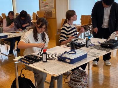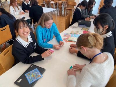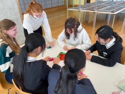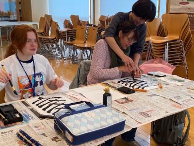 まずは、筆の持ち方、墨の付け方など、そして実際に「とめ」「はらい」の練習をしました。次に先生が準備してきた漢字を選んで思い思いに書いていました。一番人気のあった漢字は「夢」でした。また、自分の名前を漢字に変換してもらい書いていました。(マーヤ→麻亜夜、テレサ→輝沙、等々)