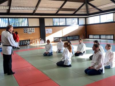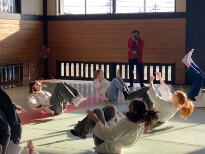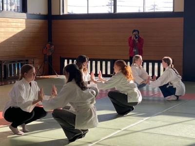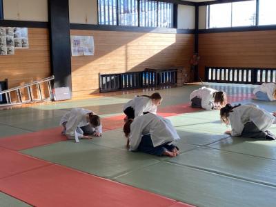 また柔道では、実際に柔道着を着て帯を締め、座り方、挨拶の仕方から受け身の練習まで体験しました。押し合いをして受け身を取るミニゲームは、大変盛り上がりました。