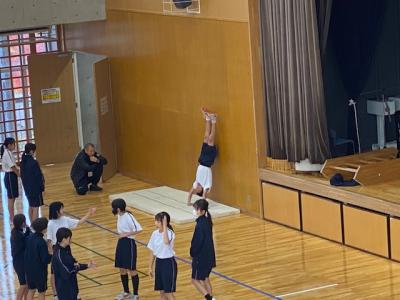 1年生の体育の授業では、器械運動(マット運動)を行っていました。1年生の単元では、回転系などの技を滑らかに行い、技を組み合わせることを目標としています。今日は、倒立に不安がある生徒に対して、担当の先生が個別で指導をしていました。この後は、前転や後転、倒立前転など、技を組み合わせてマット運動発表会の準備に入っていきます。