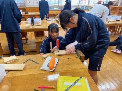 1年生の技術の授業では、「スツール(背もたれのない椅子)」作りの単元に入っています。今日は、切断線に沿ってのこぎりで板を切り、ネジ穴のマークに穴をあける作業をしていました。のこぎりを使って真っすぐ切ることにかなり時間がかかっており「真っすぐにならん…」「曲がった~」など苦労をしていました。このスツールの下の部分は、小物入れになる予定になっています。完成する日が楽しみです!