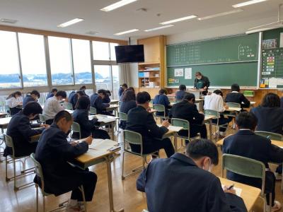 また、テスト終了後には学年集会が行われ、今後の進路学習に向けて担当の先生より話がありました。本日から始まった「ダブル・ナビ(1、2年生の復習編)」は、どの生徒も意識をして取り組むことができたと評価がありました。一年はあっという間です。一日一日コツコツやっていこう!