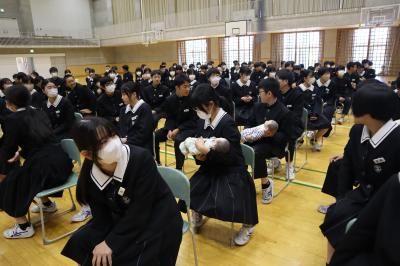 職員の方からは、心肺停止に陥った人に遭遇したときの応急手当について説明があり、生徒は人形を使って、気道確保、人工呼吸、胸骨圧迫そしてAED使用についてなどの実技を行いました。