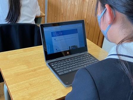 朝の挨拶に始まり、授業中の様子、係活動そして部活動と、一生懸命取り組んでいる姿が様々な場面で見られます。本日のお昼の放送では、1年生の広報委員会が担当していました。ハキハキとそして丁寧な言葉遣いで話しており、大変聞きやすい放送でしたよ。また、国語の授業では自分自身の感想をクロームブックで打ち込み、学級の友達の書き込んだ意見を共有していました。