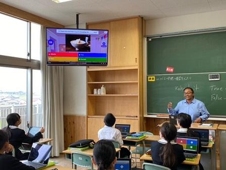 さわやかな日となりました。1年生の英語の授業では、「友達のことを紹介しよう」という課題で、ペア学習のあとにアニーシャ先生に伝えるという活動を行っていました。