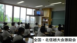 北信越大会と全国大会に出場する部活動とと選手を激励する横断幕を本日(25日)に宇ノ気体育館2階に設置しました。26日からの通知表渡しと三者懇談でご来校の際にご覧頂くとともに更なる応援をお願いいたします。