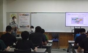 かほく市消防本部から講師を招き、生徒がアナフィラキシーショックを起こした場合を想定して職員研修が行われました。(毎年、夏休みに行っています。)
