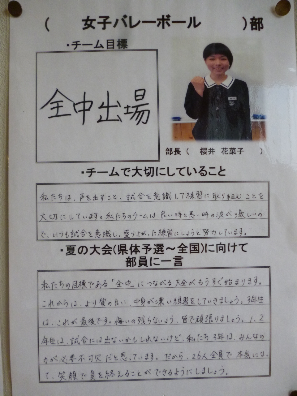 すべての運動部のキャプテンの、来る県体予選会、陸上大会への意気込みを紹介してきました。キャプテンは、自分のことだけでなく、チームのことや他の選手のことも考えて、日々一生懸命に練習していることがよく伝わります。 「最後は、思いの強い者が勝つ」と思います。どの部活動も、すべての部員も、後で悔いを残さないよう、時間の限り努力・練習し、そして大会では好結果が出ることを強く希望しています。