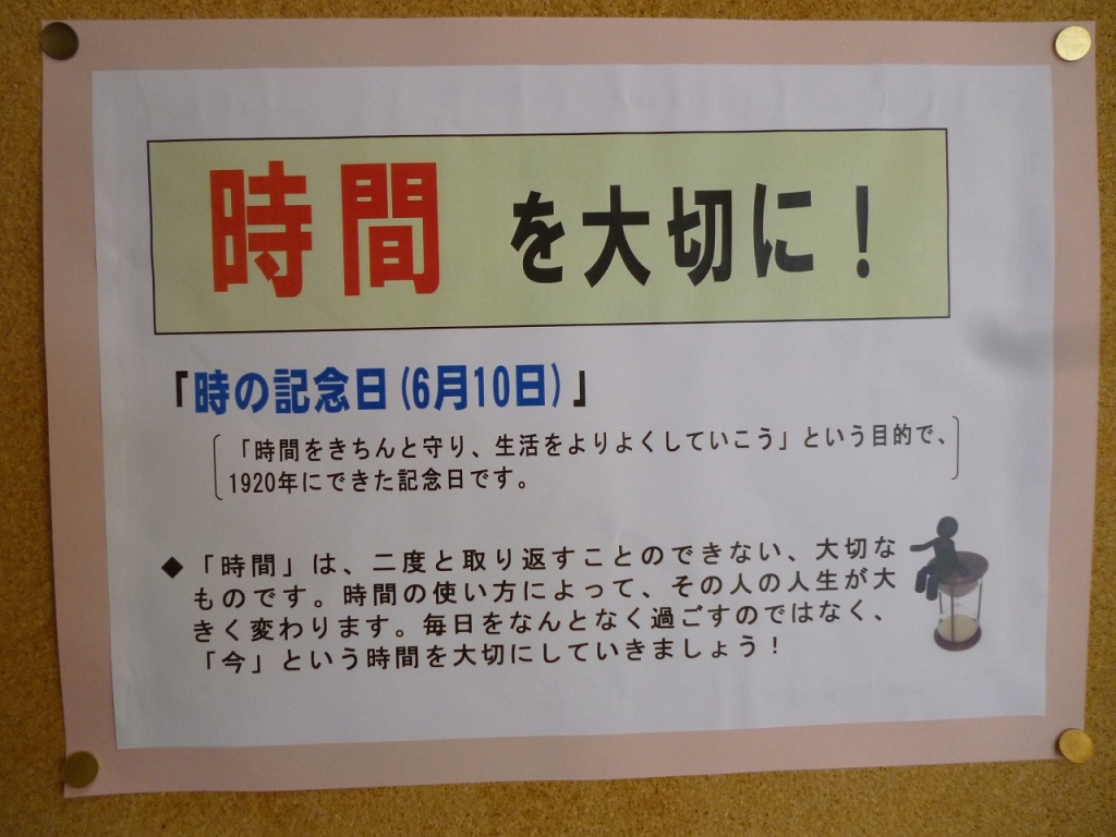 今日は金曜日、今日で今週が終わります。時間の経つのは早いもので、6月の3分の1が過ぎようとしています。6月10日は『時の記念日』です。時間は全ての人に平等に与えられているものの1つです。大事なことは、平等に与えられている時間を、どのように有効に使うかです。『時の記念日』を機会に、今一度、時間の使い方を考え(工夫し)ましょう。 『 Time is Money! 時は金なり 』 とも言われますね。