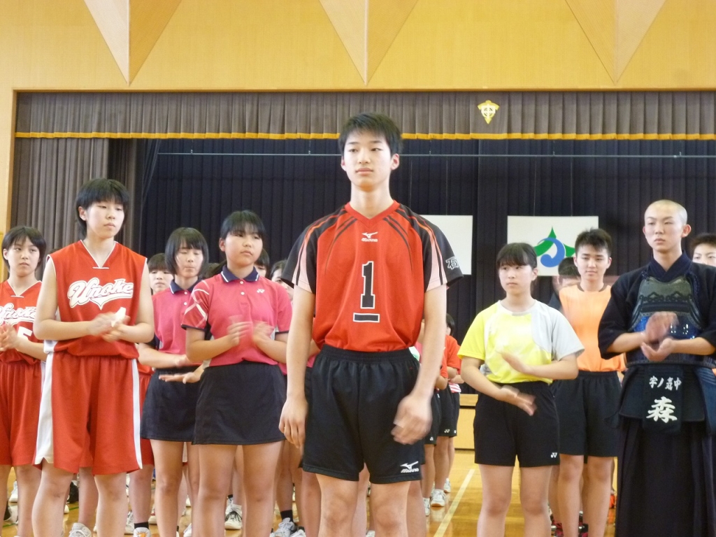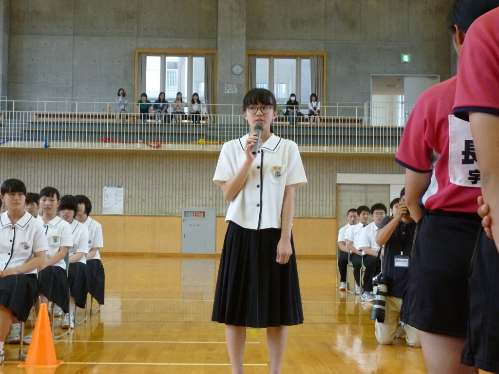 その後、生徒会副会長の中木穂菜里さん、山本校長先生から激励の言葉がありました。最後には選手を代表して、男子バレーボール部のキャプテン 高枝 駿くんが、3年生のこの大会にかける熱い思いを語ってくれました。