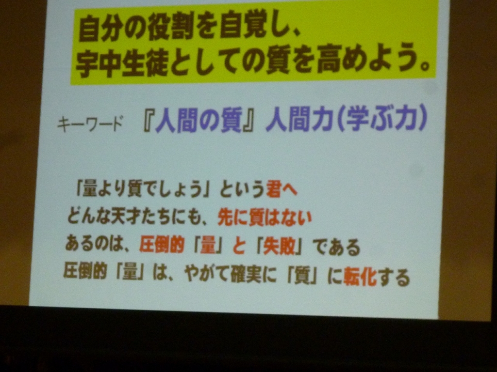 宇中生のみなさん、明日の中間テストで良い結果、満足できる結果が出せるよう、今日あと一日、精一杯テスト勉強に取り組んでください。