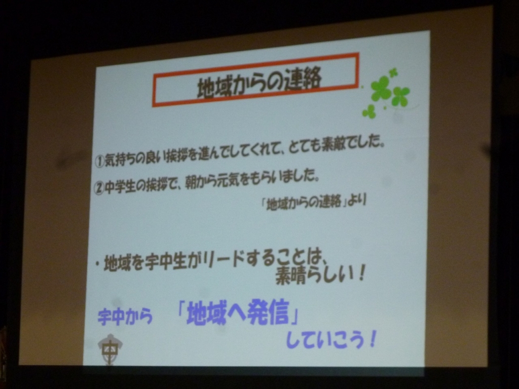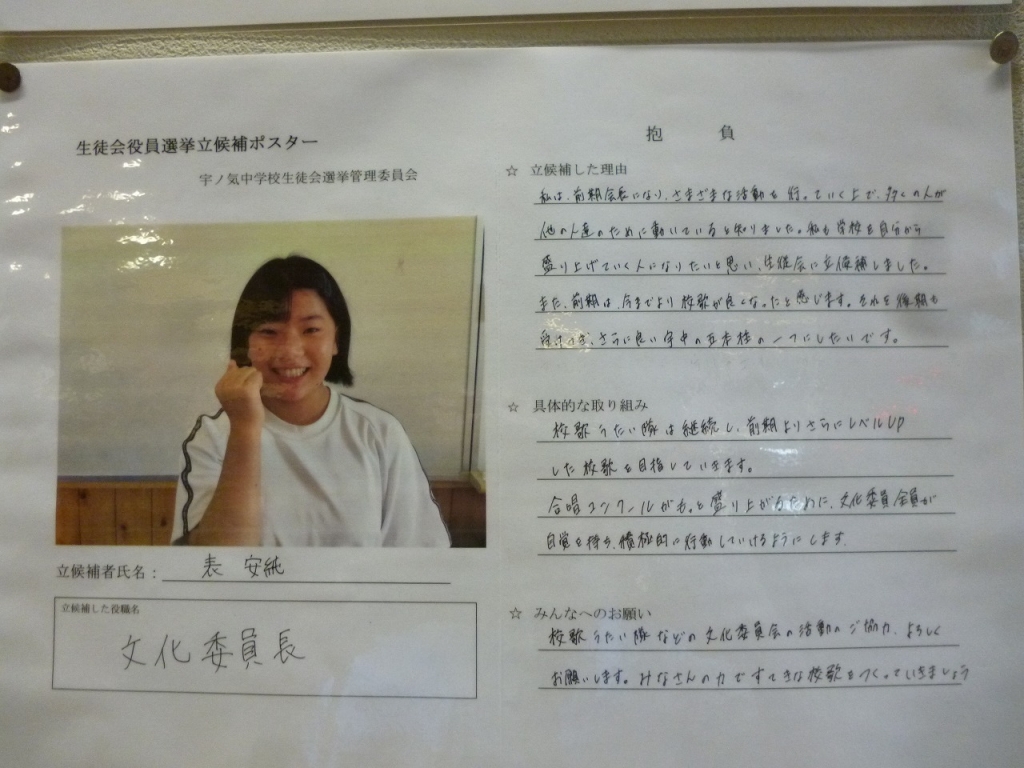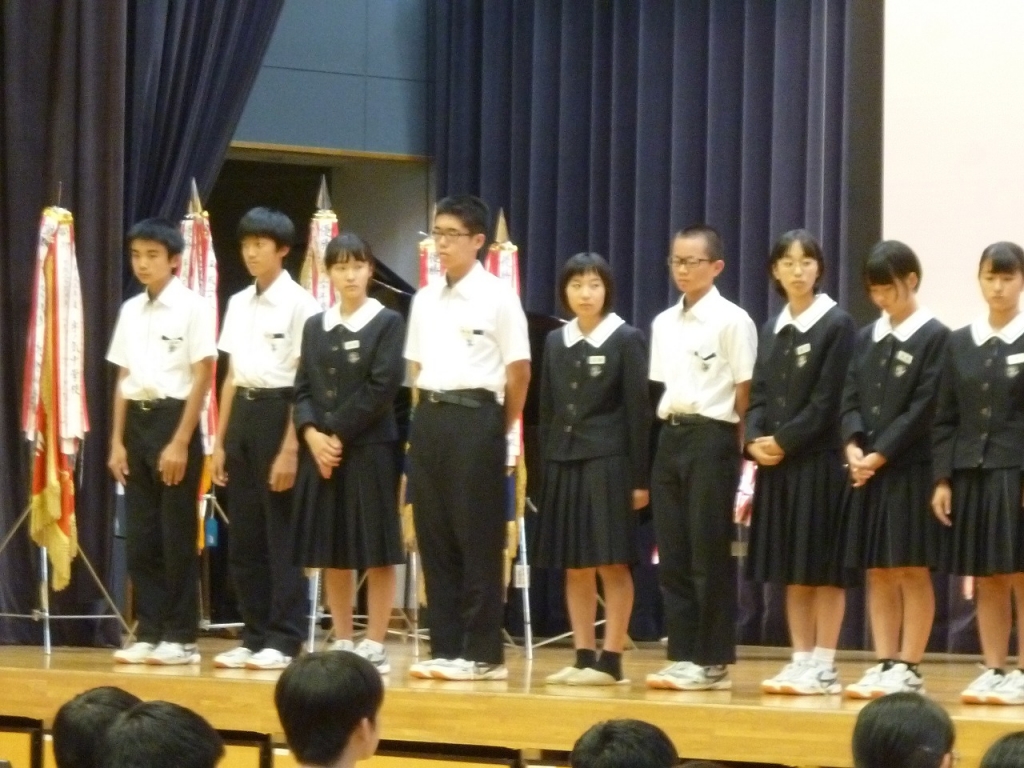 生徒会執行部のみなさん、各委員会委員長のみなさん。今持っている熱意を忘れずに、宇ノ気中学校生徒会のため、より良い学校生活のため、活躍を期待します。
