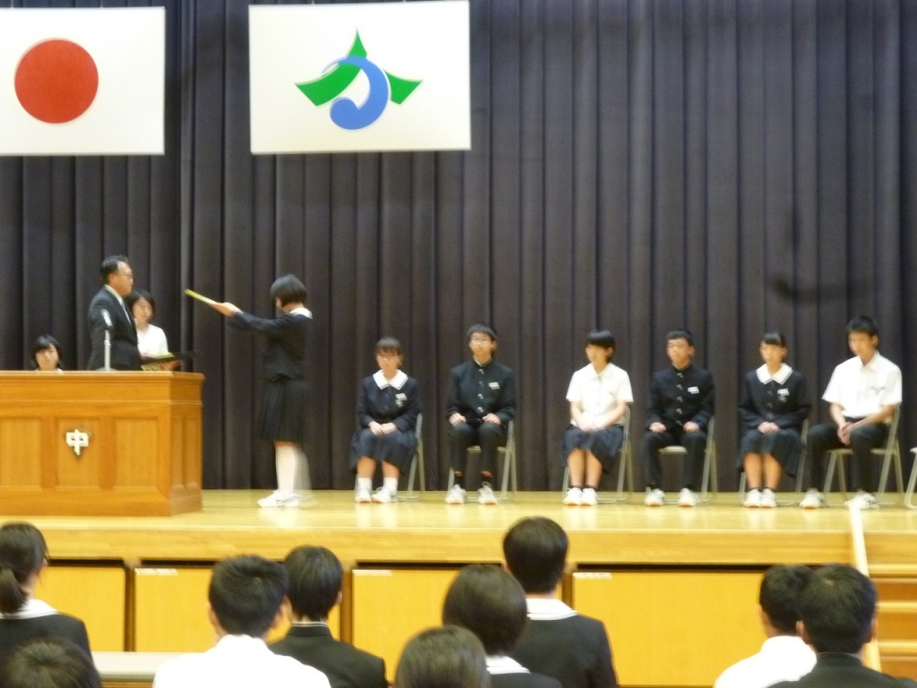 全校集会の後、後期生徒会役員・学級役員の認証式が行われました。