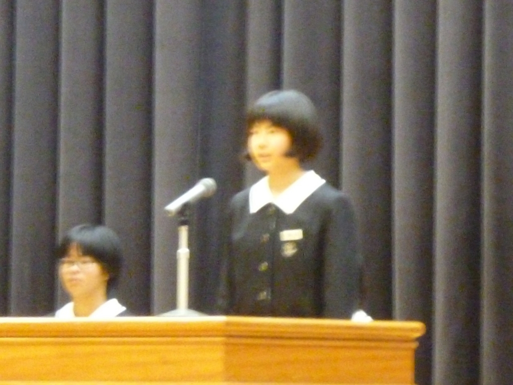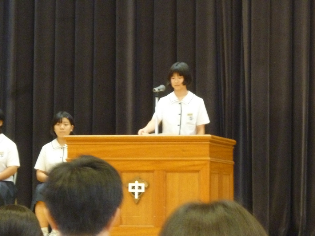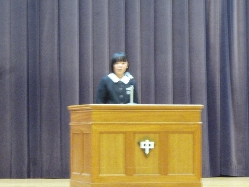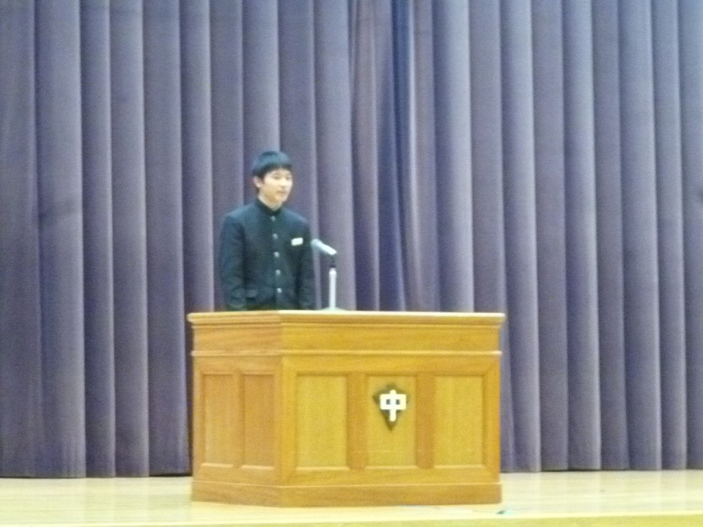認証式の始めに、前期生徒会役員の一人一人が、半年間の任期を終え、ひと言ずつメッセージを述べました。前期のみなさん、本当にごくろうさまでした。