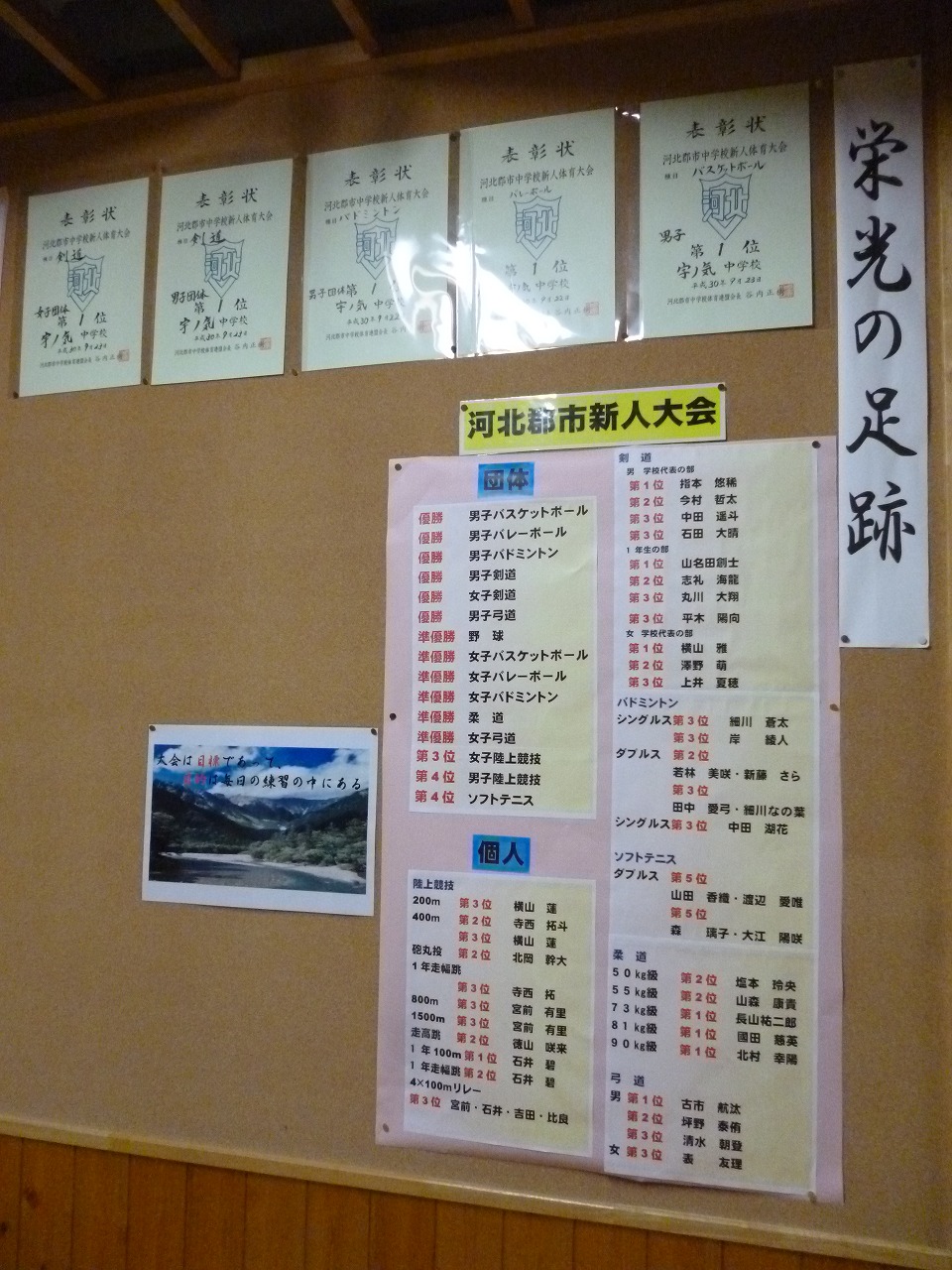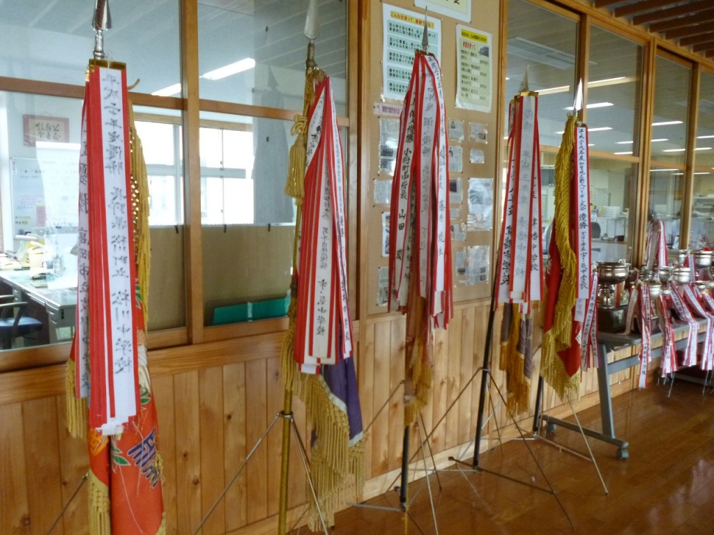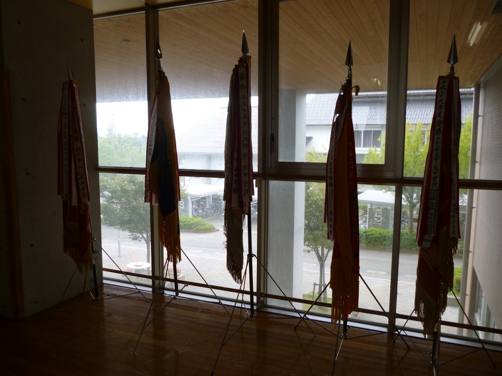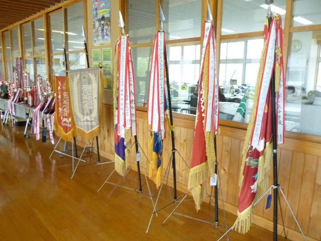 また、3年生がいた時に獲得した優勝旗(県体、北信越大会)を合わせると合計23本の優勝旗が職員室前にズラリと並んでいます。廊下の両側に並んだ優勝旗の間を歩き抜けるのはとても気分の良いものです。