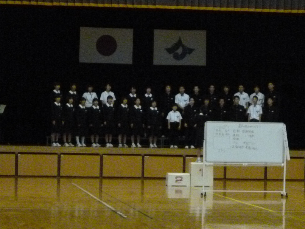今月の校歌うたい隊です合唱コンクールの最優秀賞クラスも参加しました。総勢約100名が前に並んで、大きな声で校歌を歌いました。