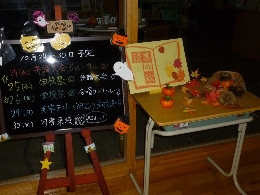 最近、中学生の活字離れが叫ばれています。今は読書をするよりも、スマホで情報を得たり、SNSの進歩で文字を送る文化が盛んになっています。ある人から、「活字離れが書く文章に大きく影響を及ぼしている」と言われました。まず、「長文を我慢強く読み、内容を読み取ることができない」だけでなく、「長い文章が書けない」、「話し言葉ばかりが目立つ」など非常に危機感を持っていると言われました。やはり中学生は読書に勤しんでほしいと思います。「読むこと」「書くこと」はもちろんのこと、想像力や創造性を育むことができます。読書の秋です。ぜひ読書をし、多くの本に触れてください。