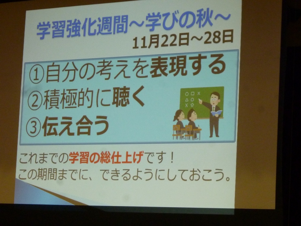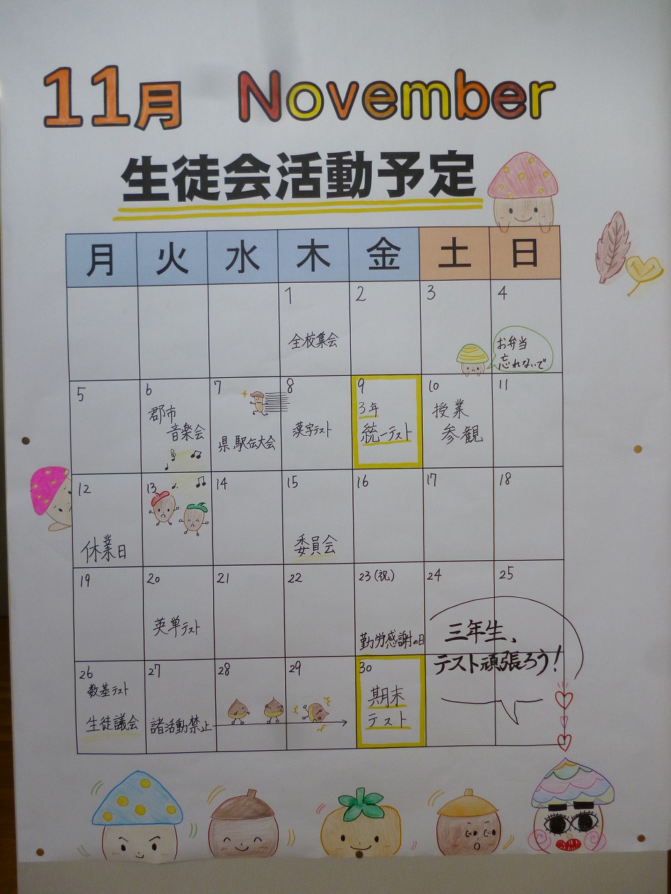 さぁ、11月です。11月は期末テストのある月です。気合いを入れて、学習に前向きに、そして自主的に取り組んでいきましょう。身の回りを整理整頓し、見通しを持って進め、学習面で自分を伸ばす1ヶ月にしましょう。