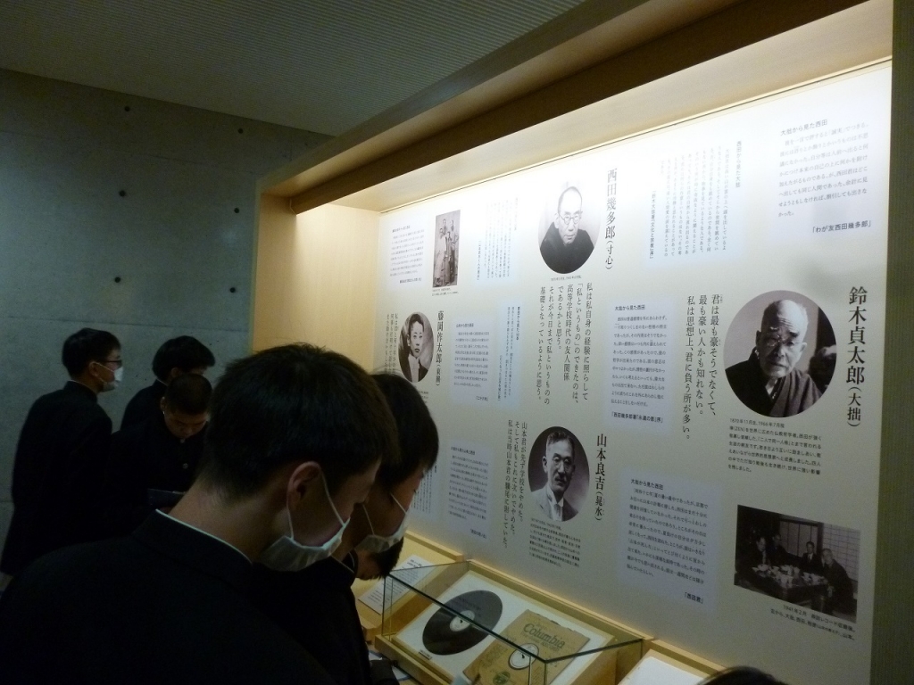 最初に西田幾多郎先生の生い立ちや哲学とは何かについて、DVDを見て学習しました。その後、クラスごとに哲学館の中をクイズラリー形式で、クイズの答えを見つけながら楽しく歩いて回りました。生徒たちは、一生懸命にクイズの答えを探しながら、哲学に対して学習を深めました。旧宇ノ気町出身である西田幾多郎先生の偉大さを深く学ぶことができました。
