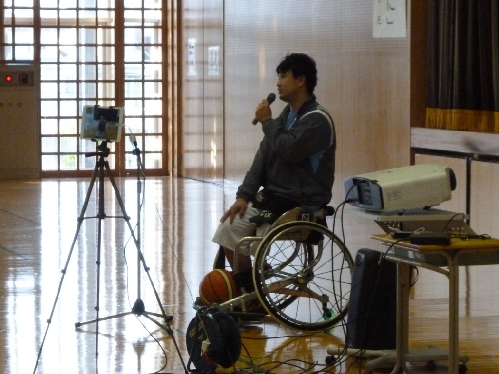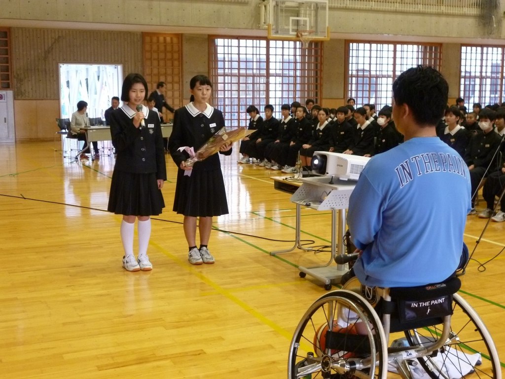 6限目は、「挫折から世界の舞台に」と題して、車いすバスケットボール選手の宮島 徹也さんの講演会がありました。宮島さんは過去3回のパラリンピックに出場し、全日本チームの中心選手としてご活躍されています。宮島選手のお話から、深い挫折を強い精神力で乗り越え、今は高い目標を掲げ、その目標を実現し、頑張っているという半生を聞くことができ、大きな感動と勇気をいただきました。宮島選手の生き方を見習い、辛いことがあっても、努力と根性で乗り越え、頑張っていくことの大切さを改めて学ぶことができました。