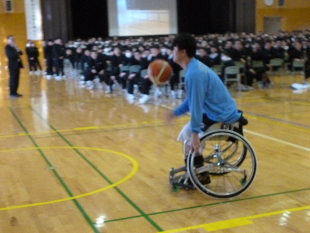 また、講演会の最後に、宮島さんはバスケットボールを使って、実際のプレーを見せてくださいました。車いすでとても軽快に動く宮島さんのスピードと、遠い位置からでもシュートを決める正確さに、生徒も保護者もとても驚嘆しました。迫力のあるプレーは全日本のトッププレーヤーの実力を知ることができました。とてもかっこよかったですね。