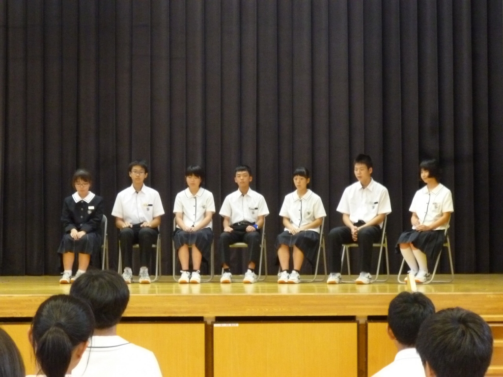 また、ドイツでは、英語で会話していたとのことで、改めて英語は世界共通語であり、コミュニケーションの上で英語が大事だということ、海外で外国人としゃべることの楽しさを強く実感したそうです。宇ノ気中生徒は、将来役に立つだろう英語の勉強に力を入れてほしいと話されました。