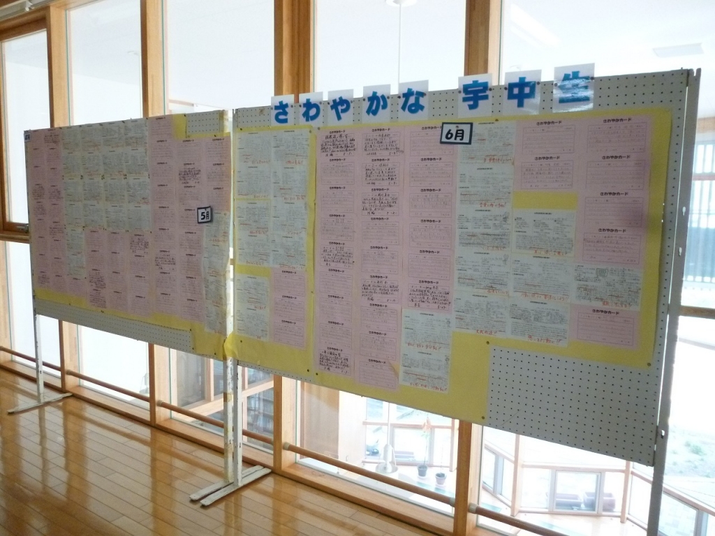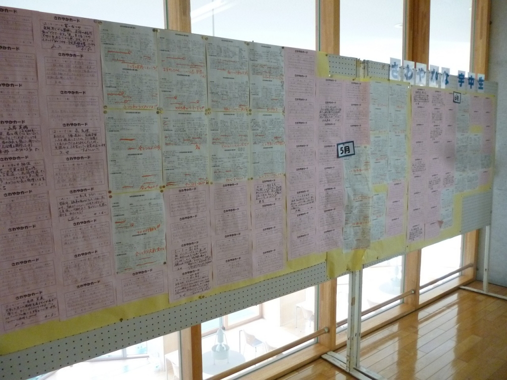 さて、半年が過ぎ、「さわやかカード」はどうなっているでしょうか。「さわやかカード」は善い行いや進んで手伝いをしてくれた生徒に対し、先生方がその行いを紹介するものです。