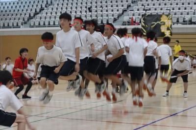 団旗審査後に、全生徒で行う「大縄跳び」から競技がスタートします。早朝よりお越しいただきました保護者の皆様、全校生徒に温かい励ましや声援をよろしくお願いします。