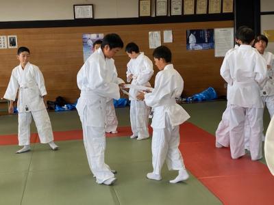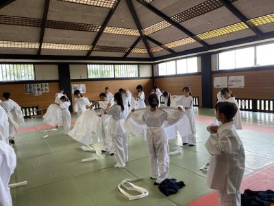 今日は、柔道着の着方、たたみ方を学習しました。「右が下でしたか?」「紐が消えました」「ちょうちょう結びこれでよかった?(蝶々結びではないよ…)」等々、50分の授業をすべて使ってしまいました。次回は、「目標1分で柔道着に着替える」と決めたようです。頑張れ、1年生!