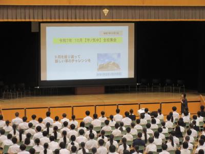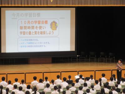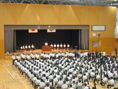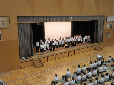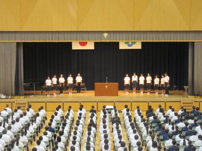 最初に3年生男子が校歌をソロで歌ってくれました。おかげで、そのあとの校歌斉唱のボリュームが上がっていたようでした。次に、表彰伝達、校長先生のお話、生活のお話、学習のお話。最後には、後期の生徒会役員任命式が行われました。