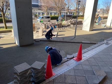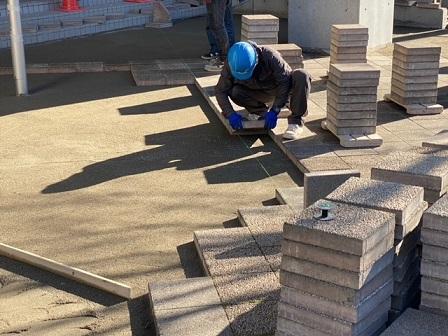 また、生徒玄関前のピロティーの修復工事が着々と進んでいます。一つ一つのブロックを種類ごとに並べ、そして固めるという大変な作業ですが、あっという間に仕上げに入っており、プロの技に驚いています。業者の皆様ありがとうございます。明日も晴れることを願っています。