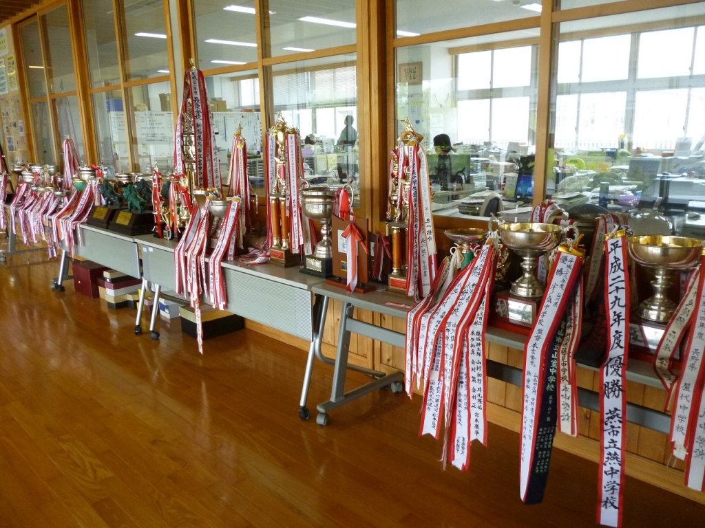 また、3年生がいた時に獲得した優勝旗(県体、北信越大会)を合わせると合計23本の優勝旗が職員室前にズラリと並んでいます。廊下の両側に並んだ優勝旗の間を歩き抜けるのはとても気分の良いものです。
