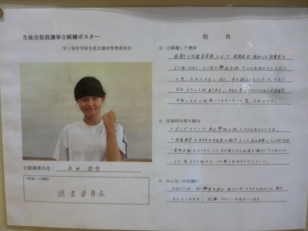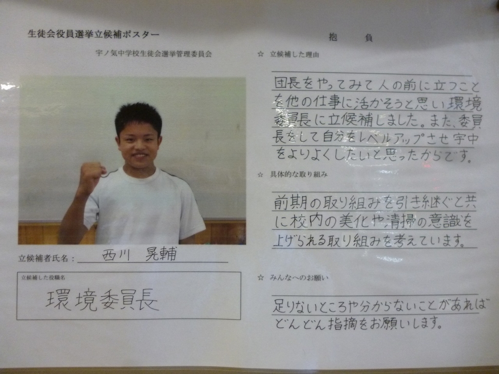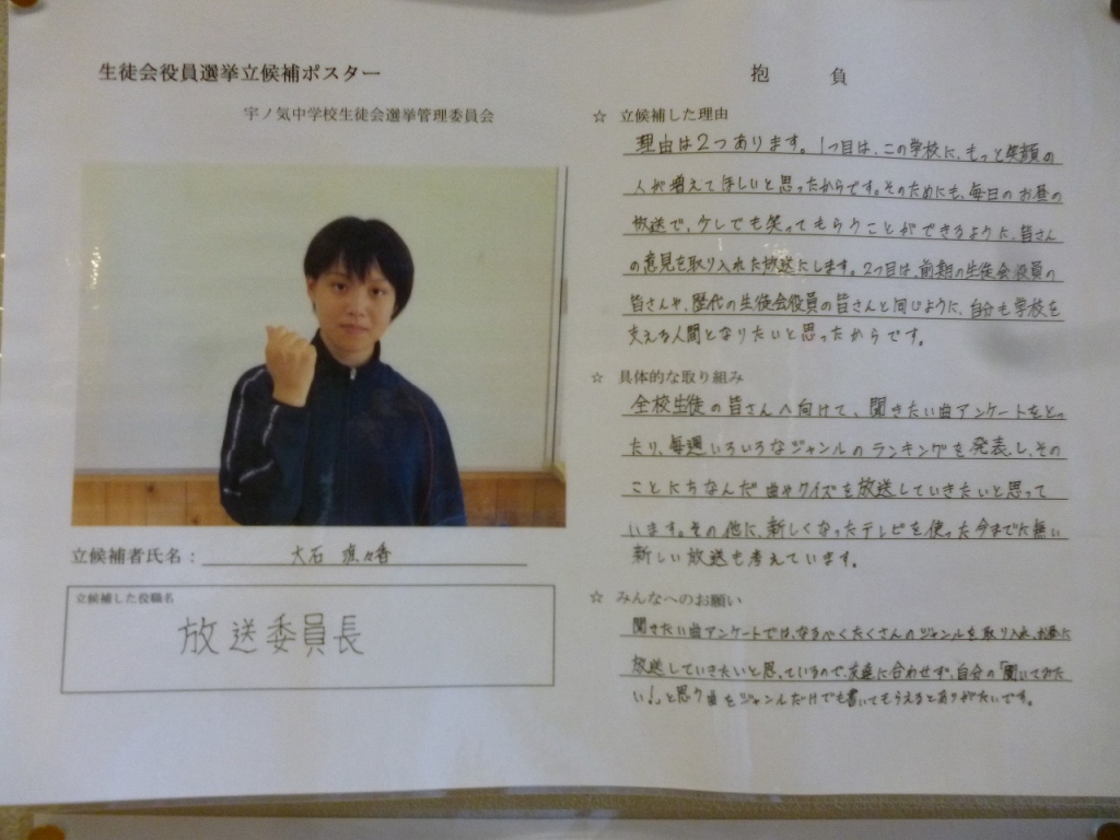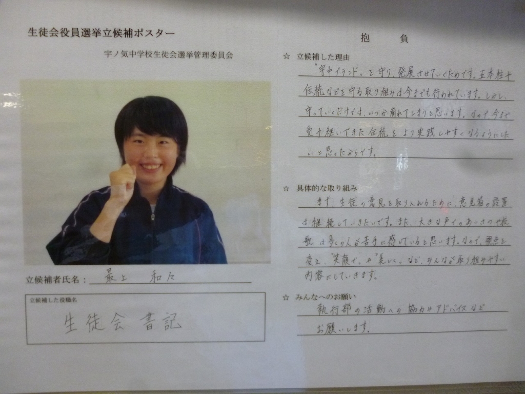 昨日の生徒会役員選挙の結果、立候補者全員が信任され、後期の役員に決定しました。(3年生の立候補者のみなさんです。)