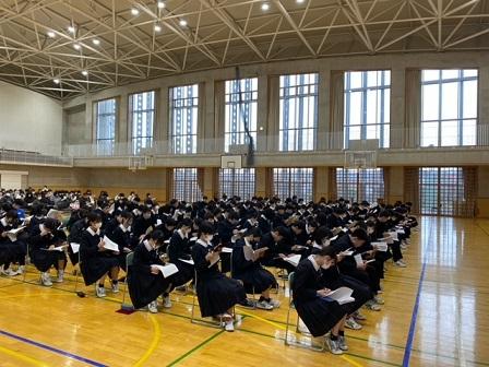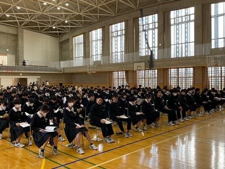 本日、3年生の進路説明会が行われました。令和6年度の入試については大きな変更点はありませんが、進路担当の先生より、入試の概要、受験手続き、今後の日程等、説明がありました。